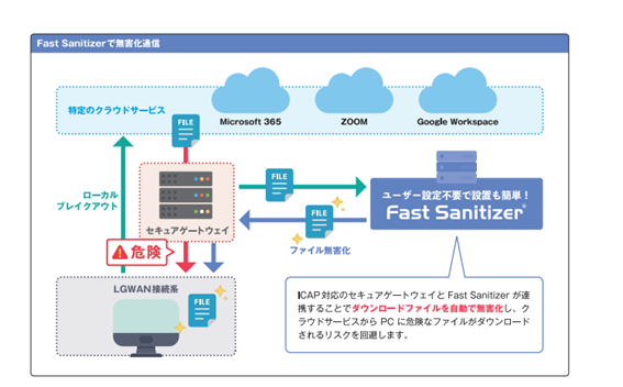 前項のセキュリティリスクに対しては、弊社製品のFast Sanitizerでファイルの無害化を実施することで対応可能です。また、LBOで特定のクラウドサービスからファイルのダウンロードを実施する際にクラウド上でファイルの無害化を実施できるだけではなく、ICAP対応のセキュアゲートウェイと連携することでダウロードファイルを自動で無害化し、クラウドサービスからエンドポイント端末に危険なファイルがダウンロードされるリスクを回避します。